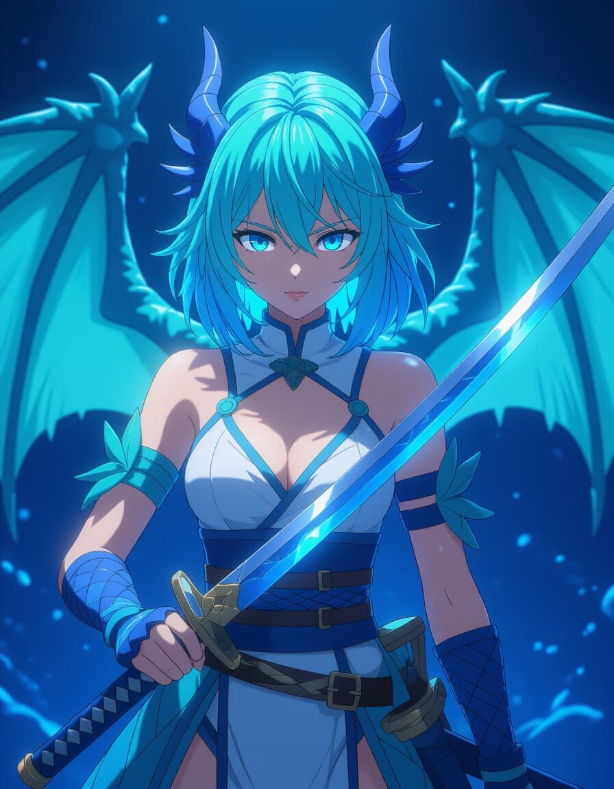 This image shows an anime woman with striking green and blue hair, large blue dragon wings, and a glowing katana. Rendered in a 3D anime art style with cinematic lighting.