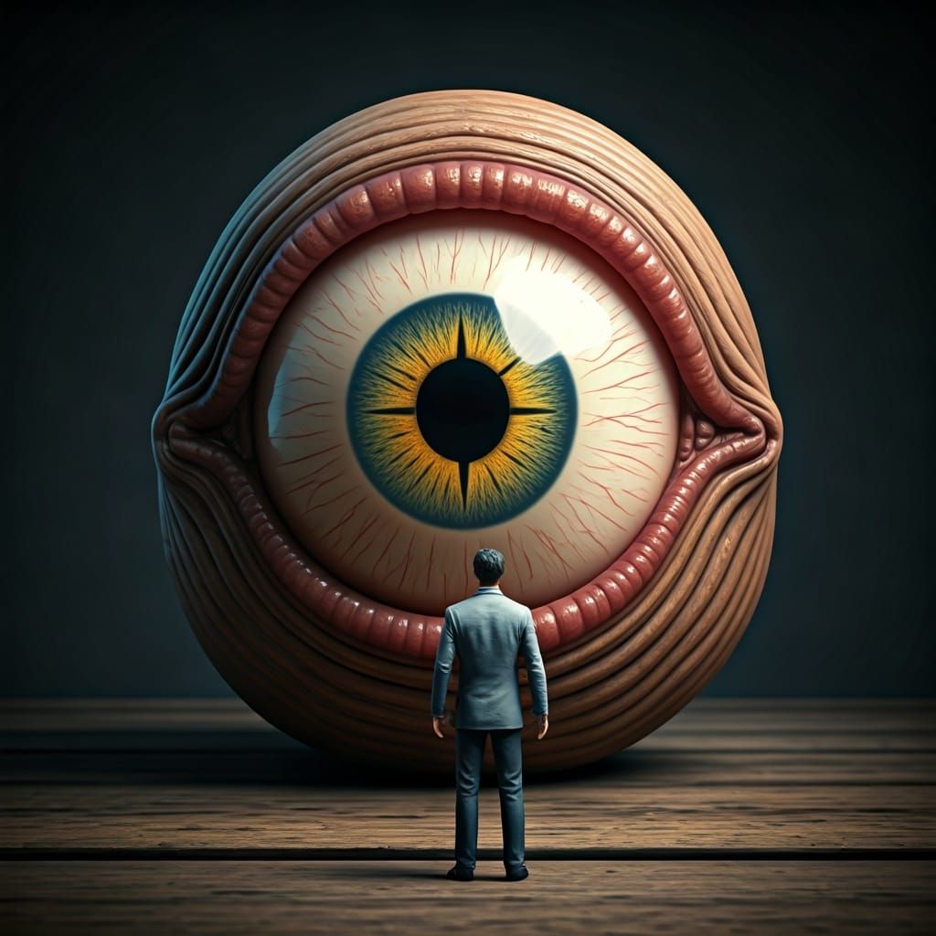 A dramatic scene of a tiny man about to be devoured by a cyclops. The image features dark fantasy and biomechanical elements in a surreal, futuristic style.