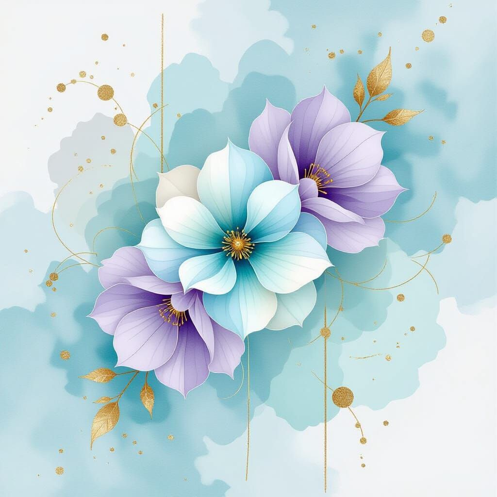 This image shows a dreamlike abstract landscape in pastel colors with gold ink splashes. The artwork features soft impressionistic light and ethereal stylization, with watercolour textures.
