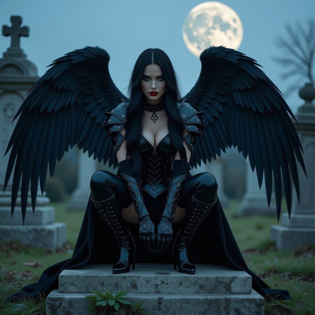 This image shows a female goddess with black wings and dark armour, posed on a tomb in an overgrown graveyard. Lightning illuminates a full moon in this cinematic, color-graded image, with a dark fantasy aesthetic.