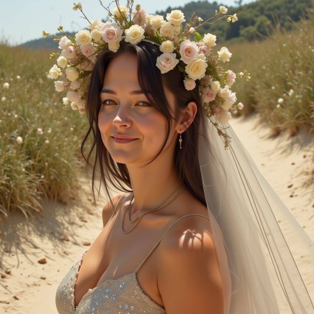 This AI-generated image depicts a solitary woman in a vast desert, evoking themes of mystery and introspection. The art style is reminiscent of a painterly, almost surreal aesthetic.