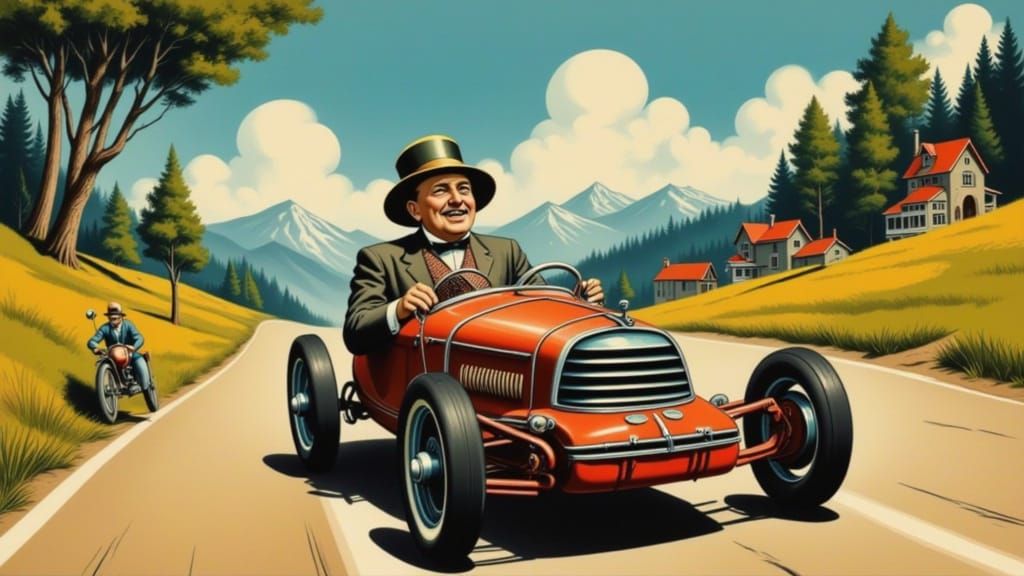 This oil painting captures Count Rotz von der Knatter in his convertible during a soapbox derby race. Rendered with impasto brushstrokes and a rich, atmospheric palette, it showcases dynamic movement and whimsical realism.