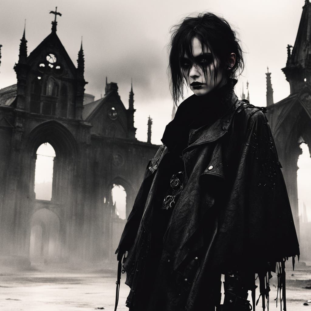 This image shows a goth woman standing in cathedral ruins. The photograph captures the scene in a dark and moody style, reminiscent of fantasy art with industrial decay and vibrant graffiti.