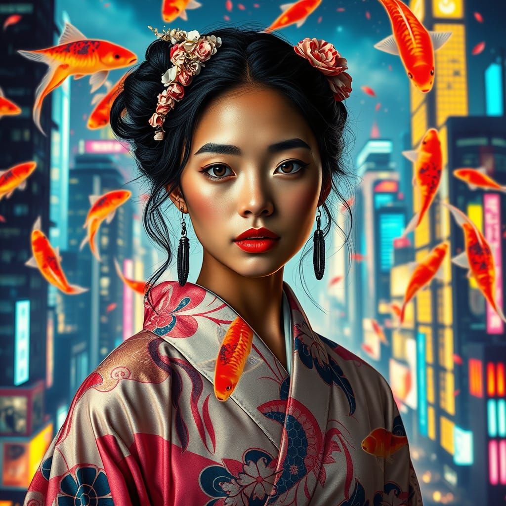 A stunning portrait of a biracial woman, half Black and half Japanese, her features a captivating blend of both heritages, dressed in an intricately designed kimono that merges traditional Japanese patterns with modern, avant-garde elements. The background features a surreal cityscape that combines elements of Tokyo and futuristic cityscapes, with holographic projections of koi fish swimming through neon-lit skyscrapers. The scene is awash with vibrant colors and ethereal light, capturing the essence of cultural fusion and futuristic beauty. Hyperrealistic rendering with intricate details, dramatic composition, and vibrant color depth, reminiscent of splash art and concept art, inspired by Alphonse Mucha and Artgerm, with a touch of cosmic surrealism.