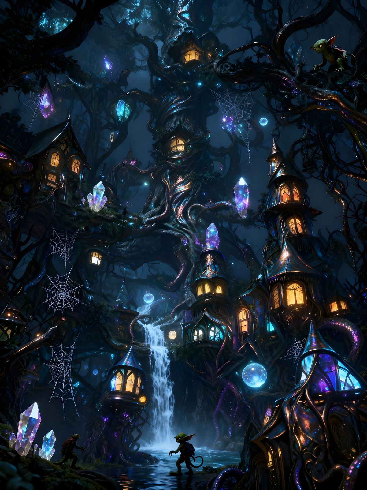 This image depicts a vibrant, glowing tree village at night, inspired by dark fairytales. It features multicolored metallic sheens, crystal lights, and mysterious creatures in a high fantasy setting.