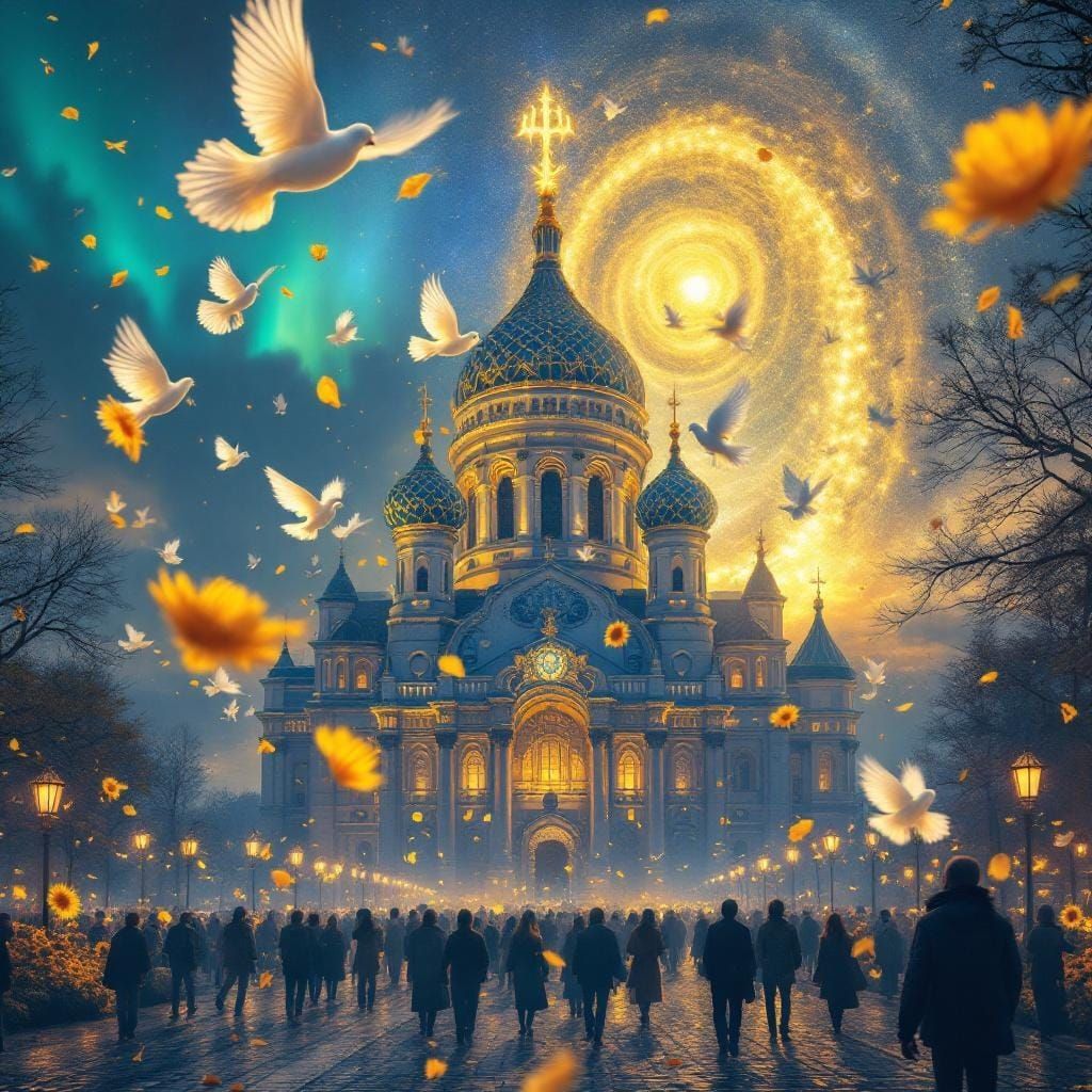 A captivating image of St. Sophia Cathedral in Kyiv, Ukraine, under a twilight sky with golden auroras. Doves with embroidered wings fly above Byzantine domes as crowds celebrate Vyshyvanka Day. The image blends surreal and grunge textures.