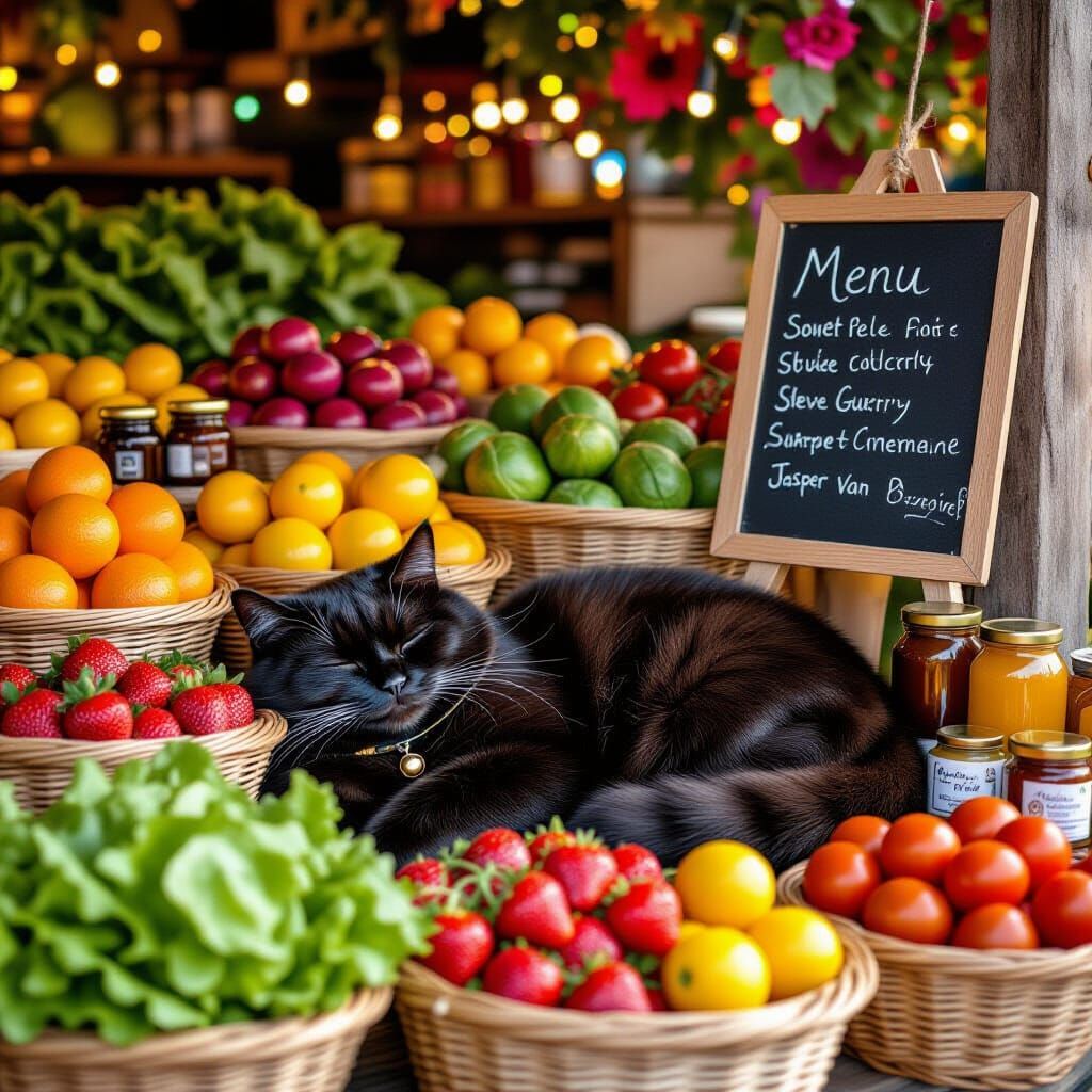 A chubby black cat sleeps peacefully among colorful fruit and vegetable baskets on a wooden market stall. The scene features fairy lights and warm sunset tones, rendered in a hyperrealistic, high-contrast style.