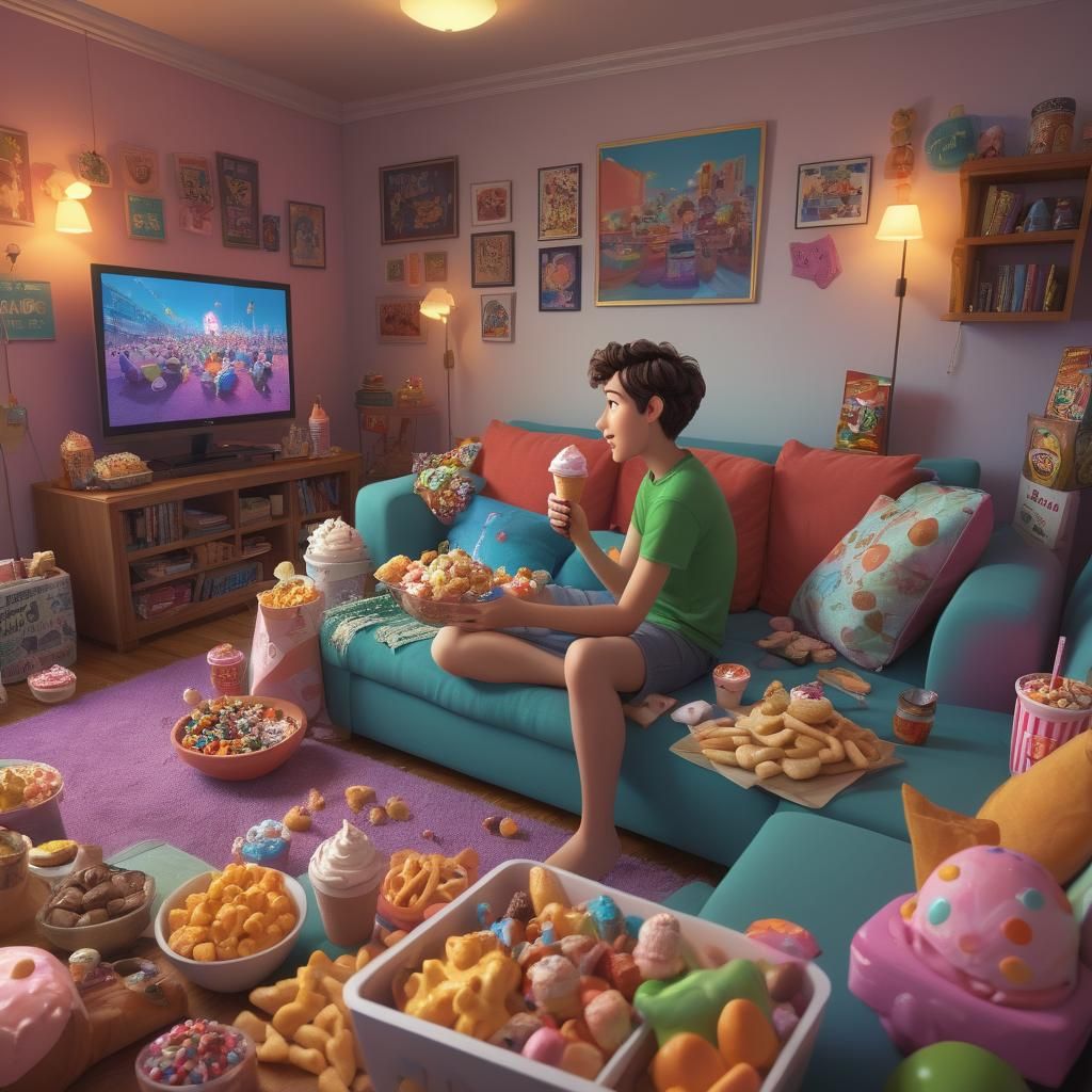 This image shows a person on a couch, surrounded by junk food and snacks, eating ice cream, and watching TV. The image is a vibrant and colorful 3D animation in a Pixar style.