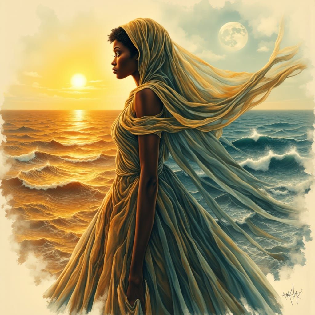 A captivating illustration of a Black girl's double exposure portrait, face serene and mysterious. Her silhouette merges a golden desert and tranquil ocean, connecting fire and water.