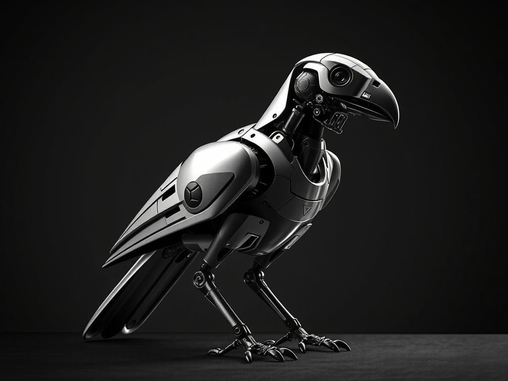 This image showcases an ultra-detailed, photorealistic close-up of a robotic bird. High-contrast lighting and sharp metallic textures highlight its intricate anatomy in a stark black and white concept art style.
