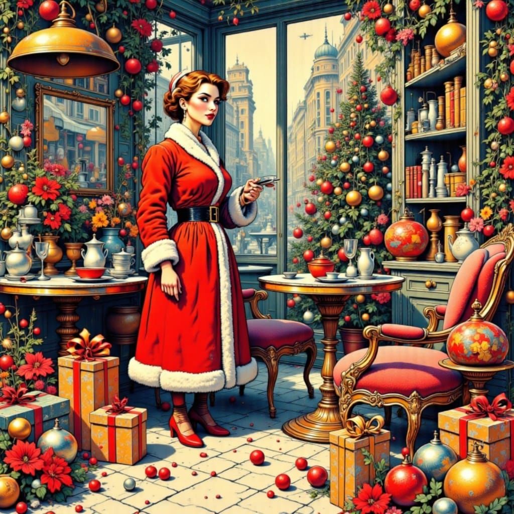 Generate your own vintage Christmas images with Santa in mid-century style. Free and easy AI art creation.