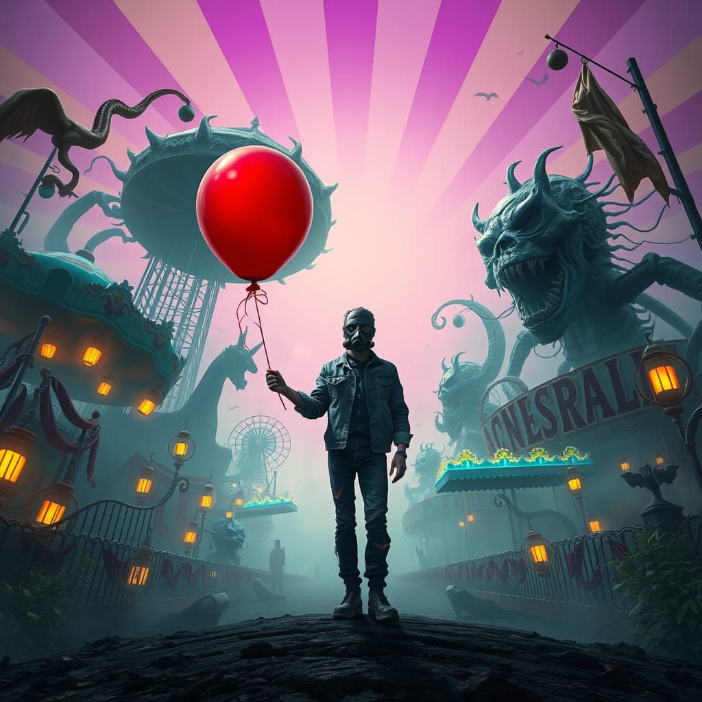 This image shows a solitary figure with a red balloon in a desolate carnival. Twisted rides are consumed by glowing flora, all cast in eerie fog with warm-toned lights, in a dark fantasy style.