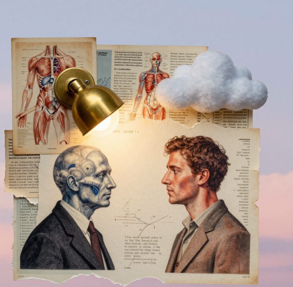 Collage art. intellectual dialogue over Artificial Intelligence Medical drawings and mismatched vintage postcards and torn paper scraps, pastel-colored sky. Collage art. Brass knob, emitting a soft, inviting glow. A single, stylized cloud drifts by. Nostalgic, vintage ephemera,