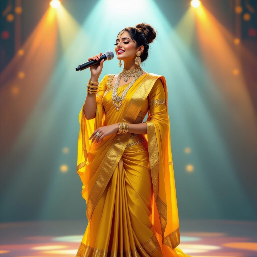 This image shows a captivating Indian woman singing passionately center stage, dressed in glamorous yellow. The digital painting captures a majestic performance atmosphere with vibrant lighting.