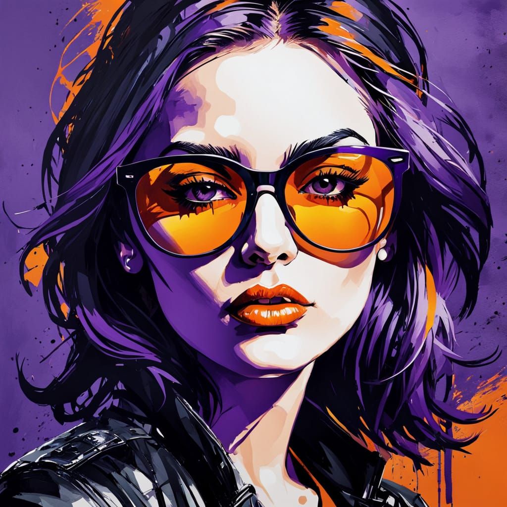This image showcases a close-up of a young woman rocker wearing black sunglasses, rendered in a dynamic acrylic painting style with expressive bold lines and vivid purple and orange hues.