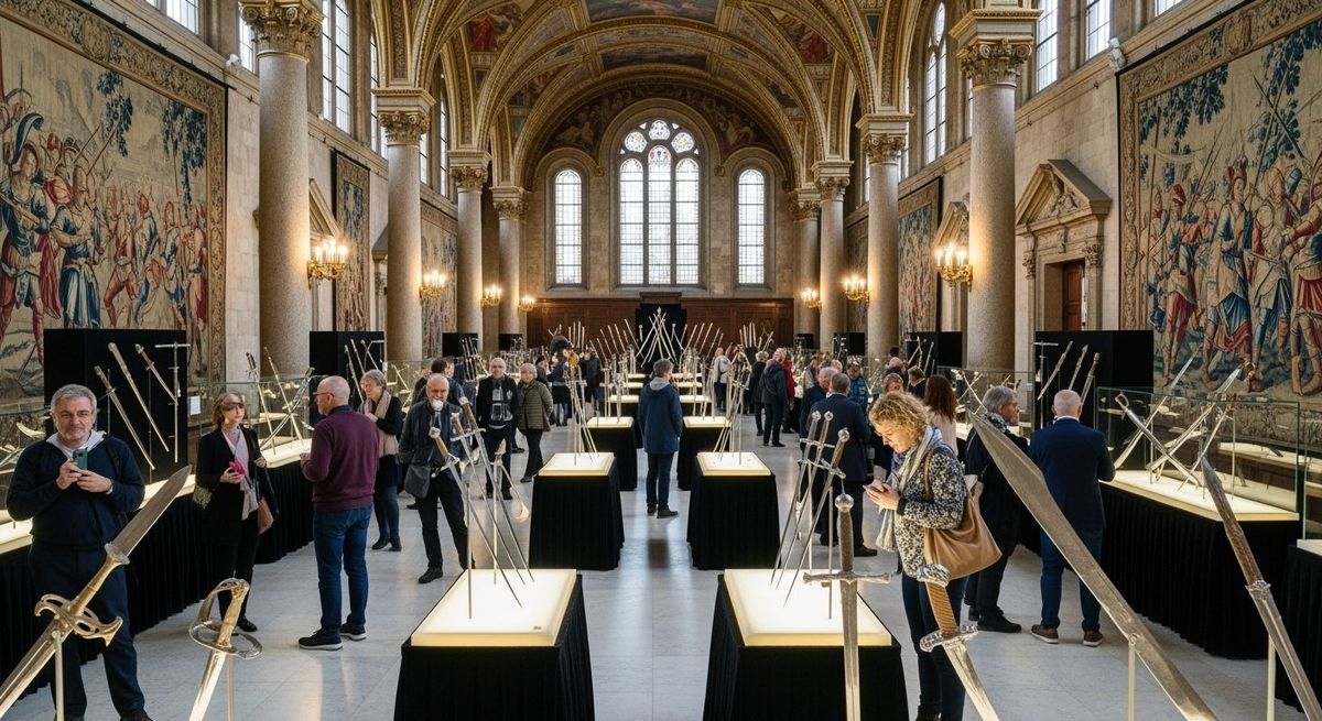 This image showcases a magnificent hall displaying a vast collection of historical swords from different eras and cultures. Visitors admire the ancient blades in this richly decorated antique setting.