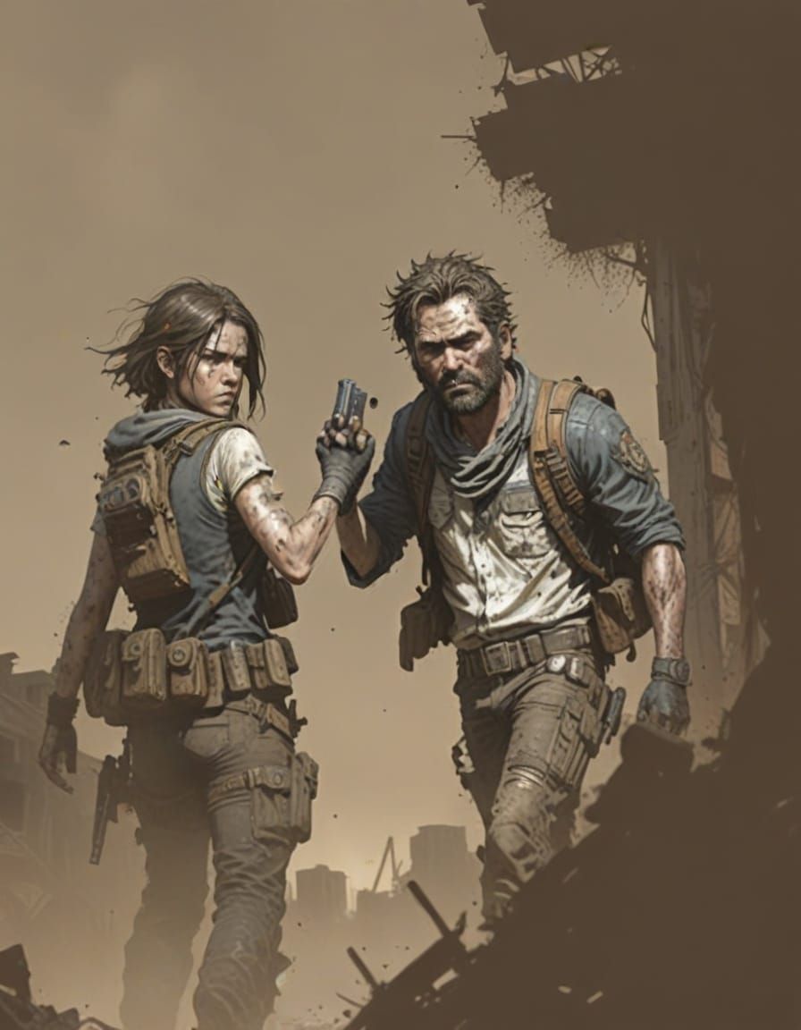 A striking image of two armed figures standing back to back in a desolate wasteland, captured in high-contrast comic book realism with intricate details and bold color accents.