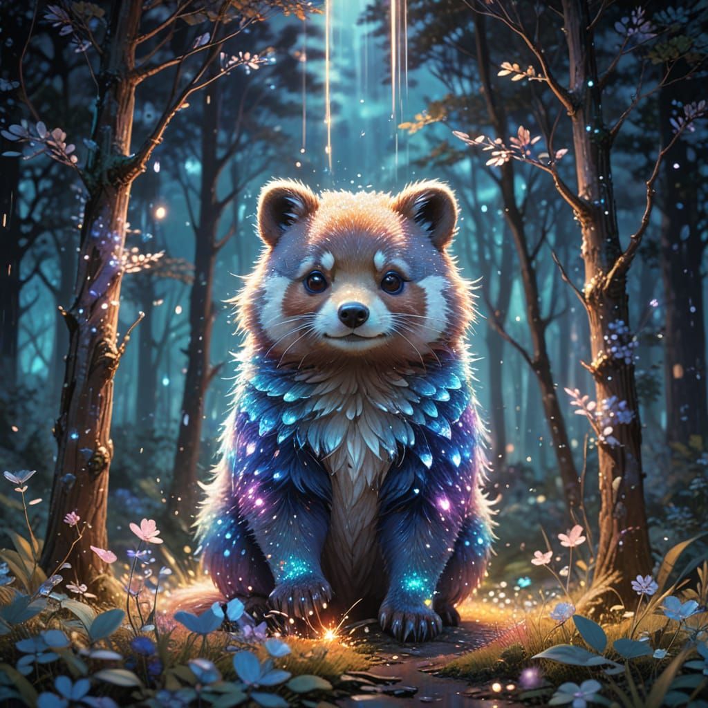 This enchanting image features a magical tanuki surrounded by a shimmering holographic aura, set against a backdrop of soft, natural lighting with a warm glow. Delicate lines, intricate details, and beautiful composition come together in a whimsical, dreamy atmosphere, evoking the style of Makoto Shinkai...