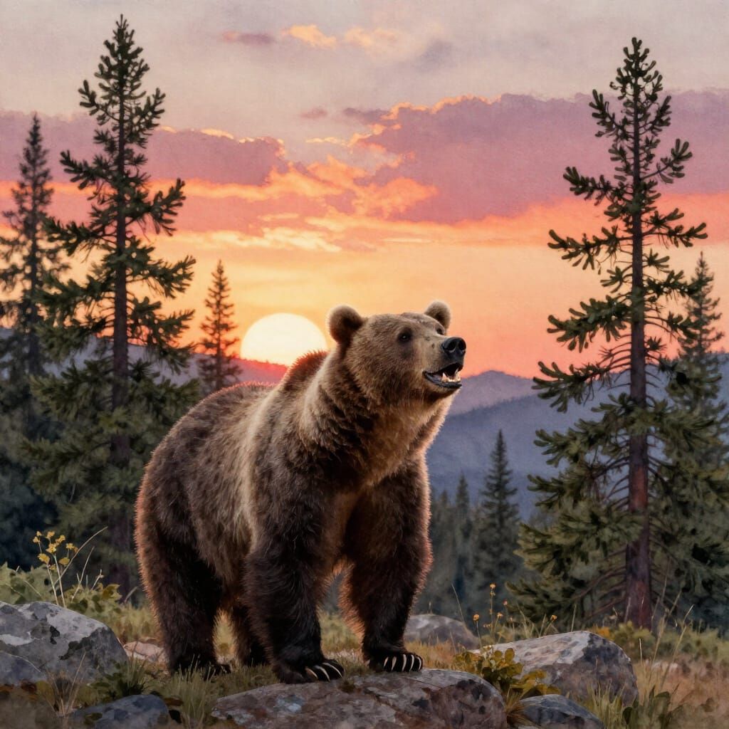 This image shows a solitary grizzly bear standing, roaring with teeth bared, in the Rocky Mountains at sunset. Tall pines frame the scene, with a vibrant, painterly sky. Rendered in a watercolor style.