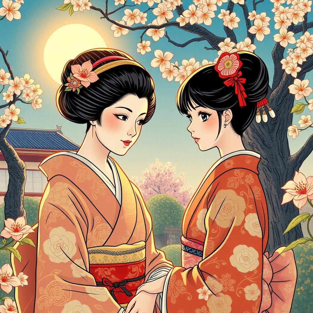 This image depicts a traditional Geisha encountering a vibrant Manga girl within a serene Japanese garden. Rendered in a detailed Ukiyo-e woodblock print style, the scene captures a harmonious atmosphere with soft sunlight.
