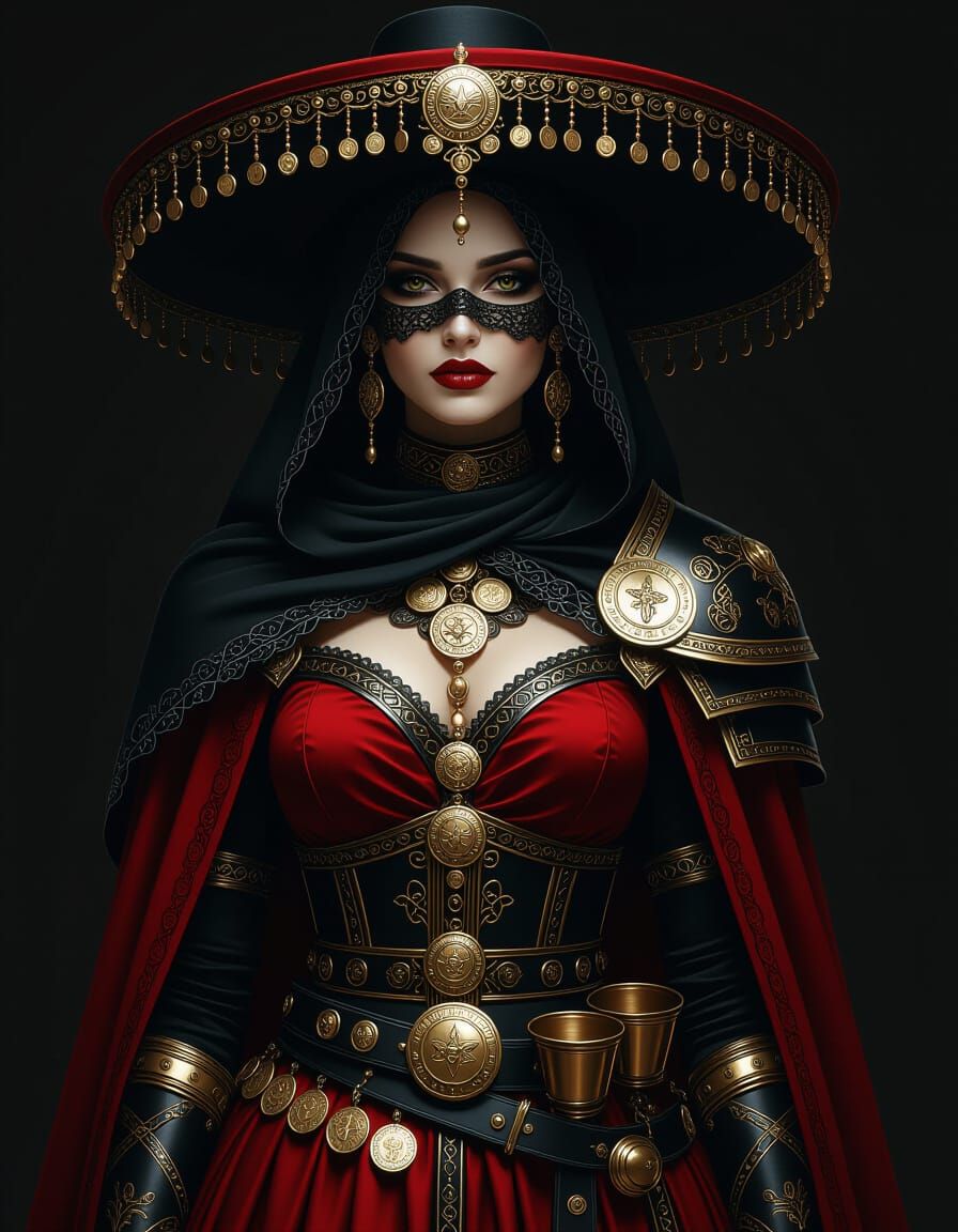 This image shows a gothic knight in crimson and black armor, influenced by Moroccan costume. Ornate details, veiled eyes, and mystical symbols enhance the dramatic, colorful digital painting.