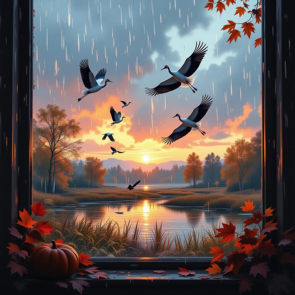 Easily generate images of birds flying south for the winter. Describe your own beautiful autumn scene. It's free!