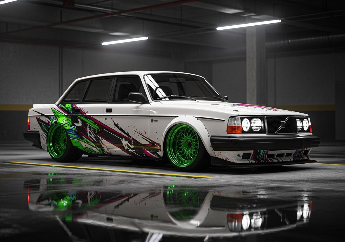 A 3D rendering of an aggressively designed Volvo 240 Turbo in a garage. The car features white paint, street art vinyl, green mesh rims, and a Rocket Bunny widebody kit in a hyper-realistic digital art style.