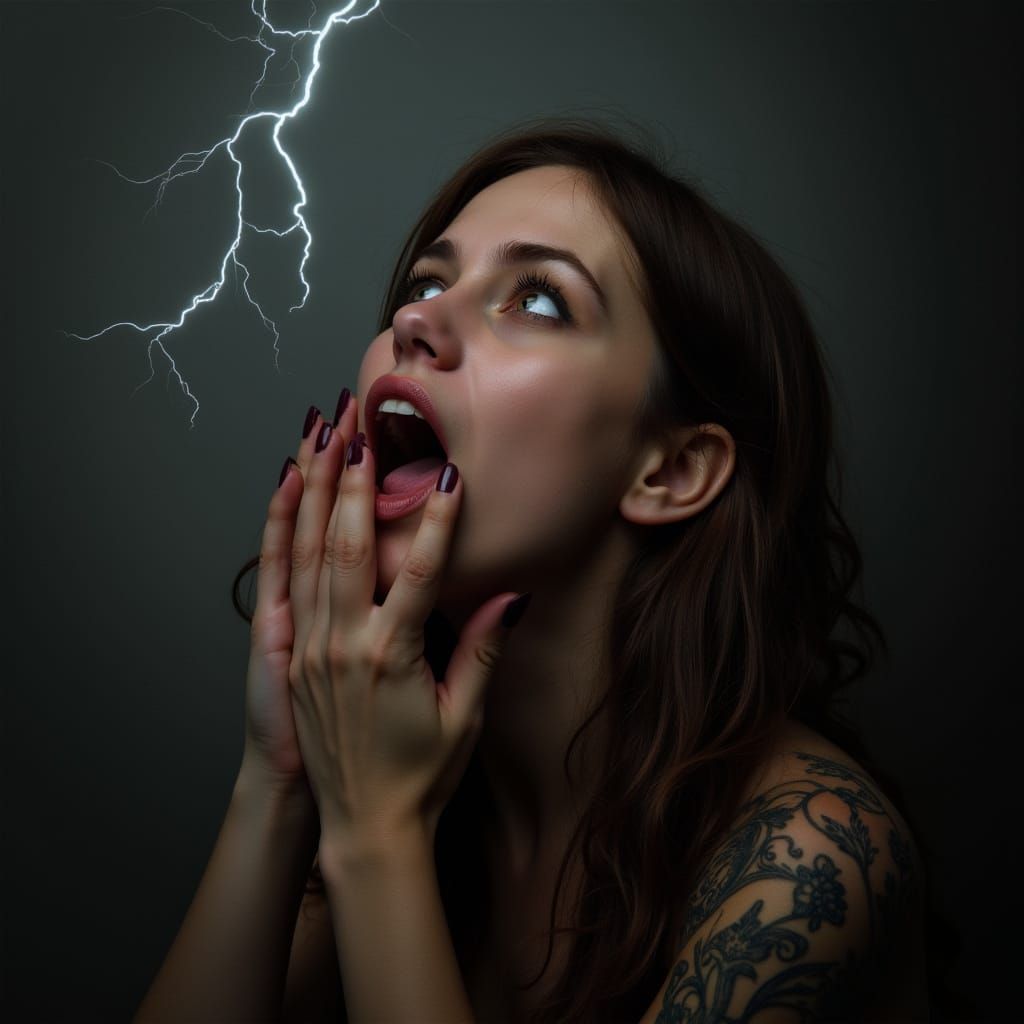This haunting image depicts a woman consumed by fear, her face contorted in anguish as she claws at her own visage. The dramatic lighting casts a sense of desperation, highlighting the turmoil within.