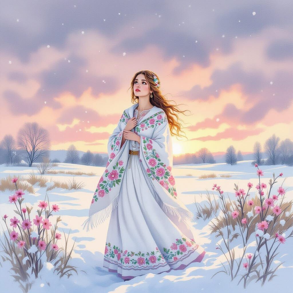 This image shows a Ukrainian woman in traditional dress standing in a snowy field as a storm approaches. She wears an embroidered shawl and Vyshyvanka in a watercolor style, gazing sorrowfully at the sky.