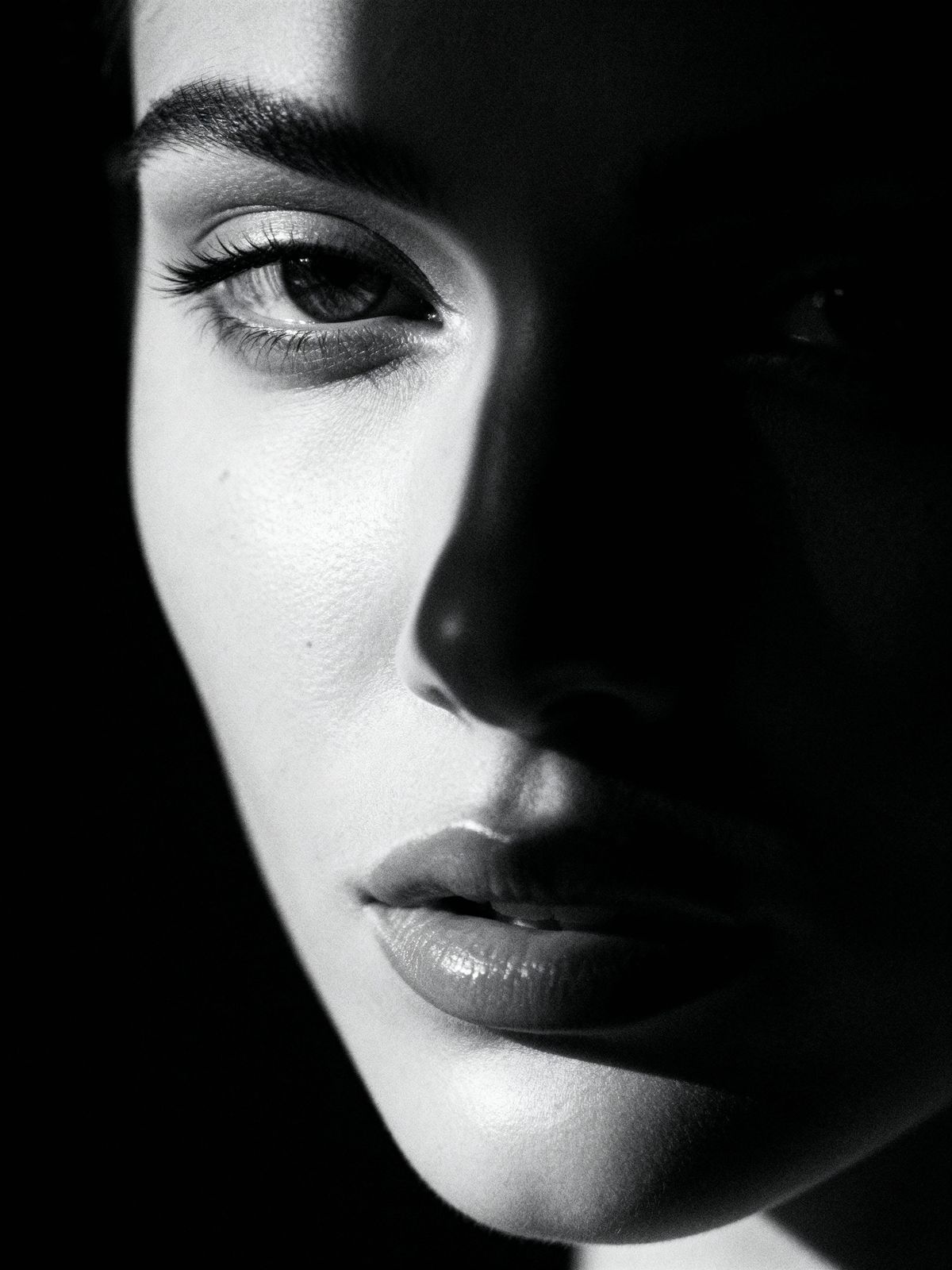 This image showcases an extreme close-up portrait of a gorgeous young model's face, dramatically half-lit in total darkness, captured in artistic photographic style.