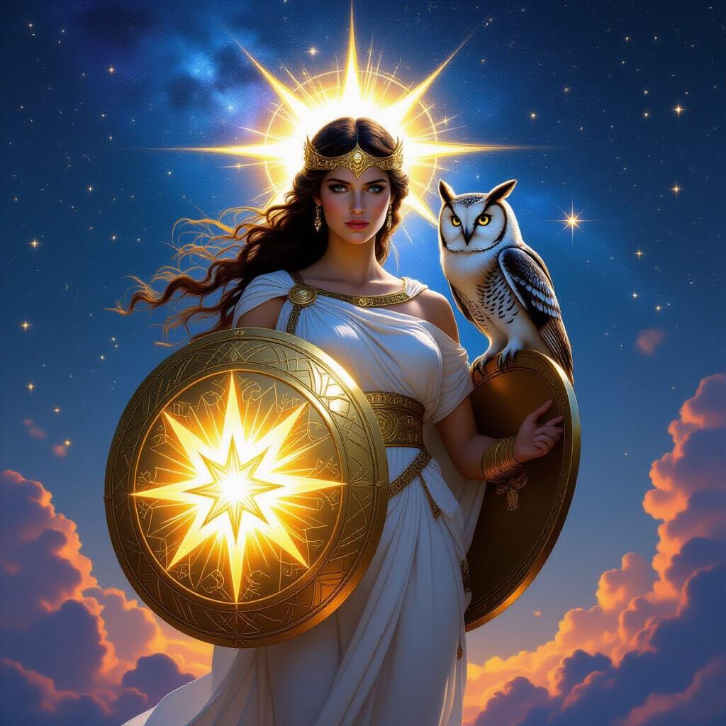 This image shows Athena, the Greek goddess of wisdom, beneath a starry sky. She holds a radiant shield, with her owl companion nearby. The art features cosmic fantasy elements and dramatic lighting.