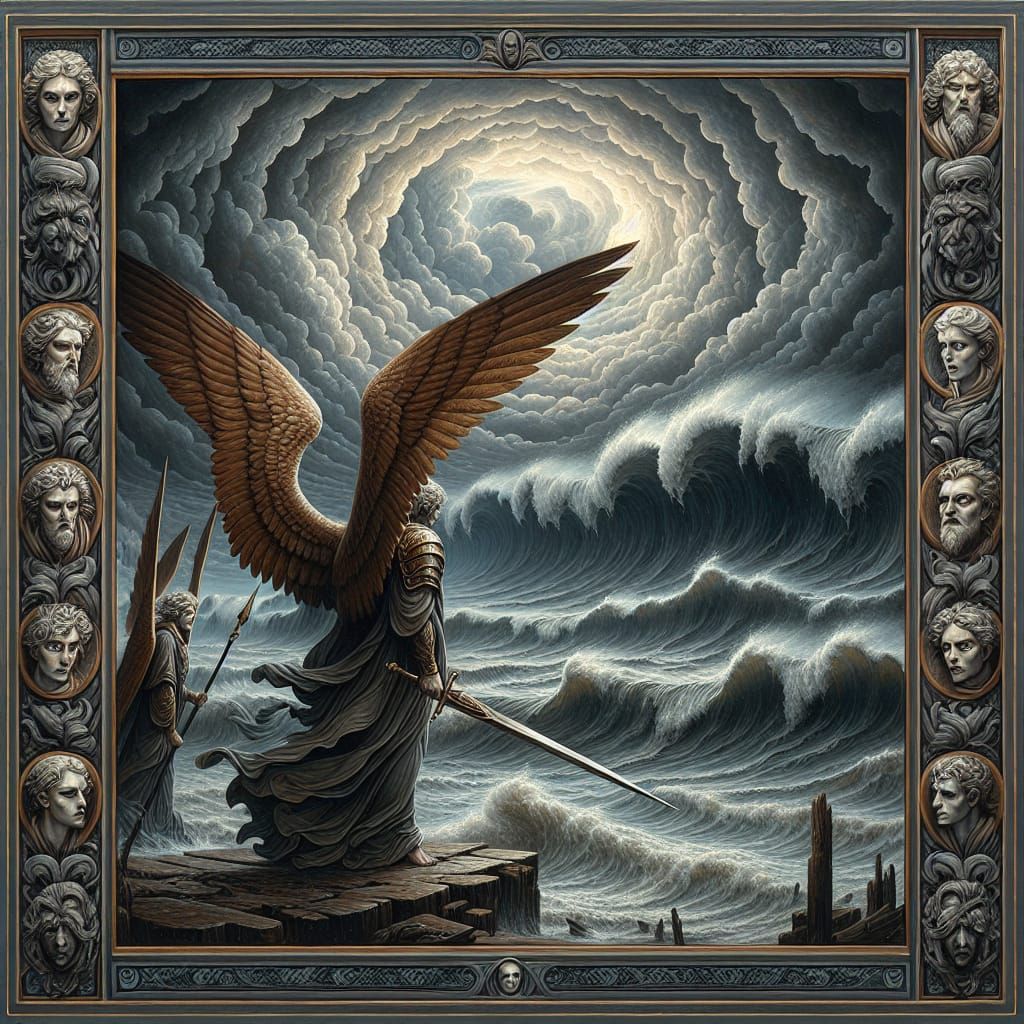 A dramatic image of a sturdy, stern figure with brown wings holding a sword. Behind them, a tumultuous sea rages under a dark, stormy sky. An ornate border with intricate faces frames the scene.