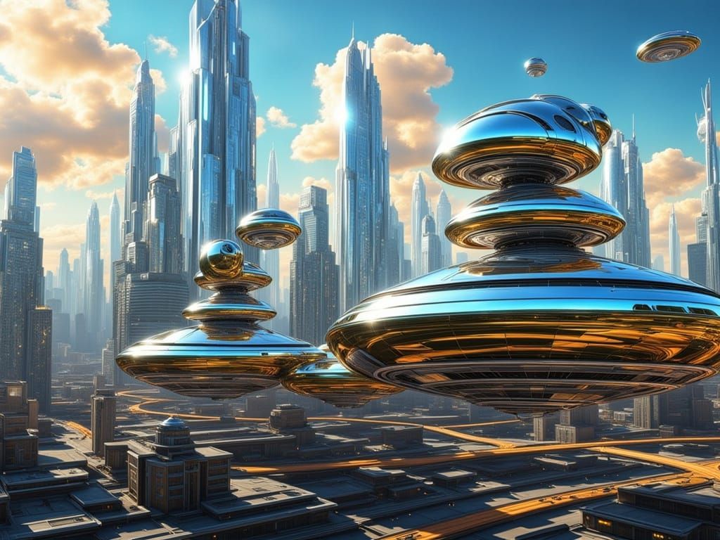 This image shows a futuristic city with sleek chrome buildings and flying cars soaring through the sky, depicted in a vibrant cyberpunk aesthetic.
