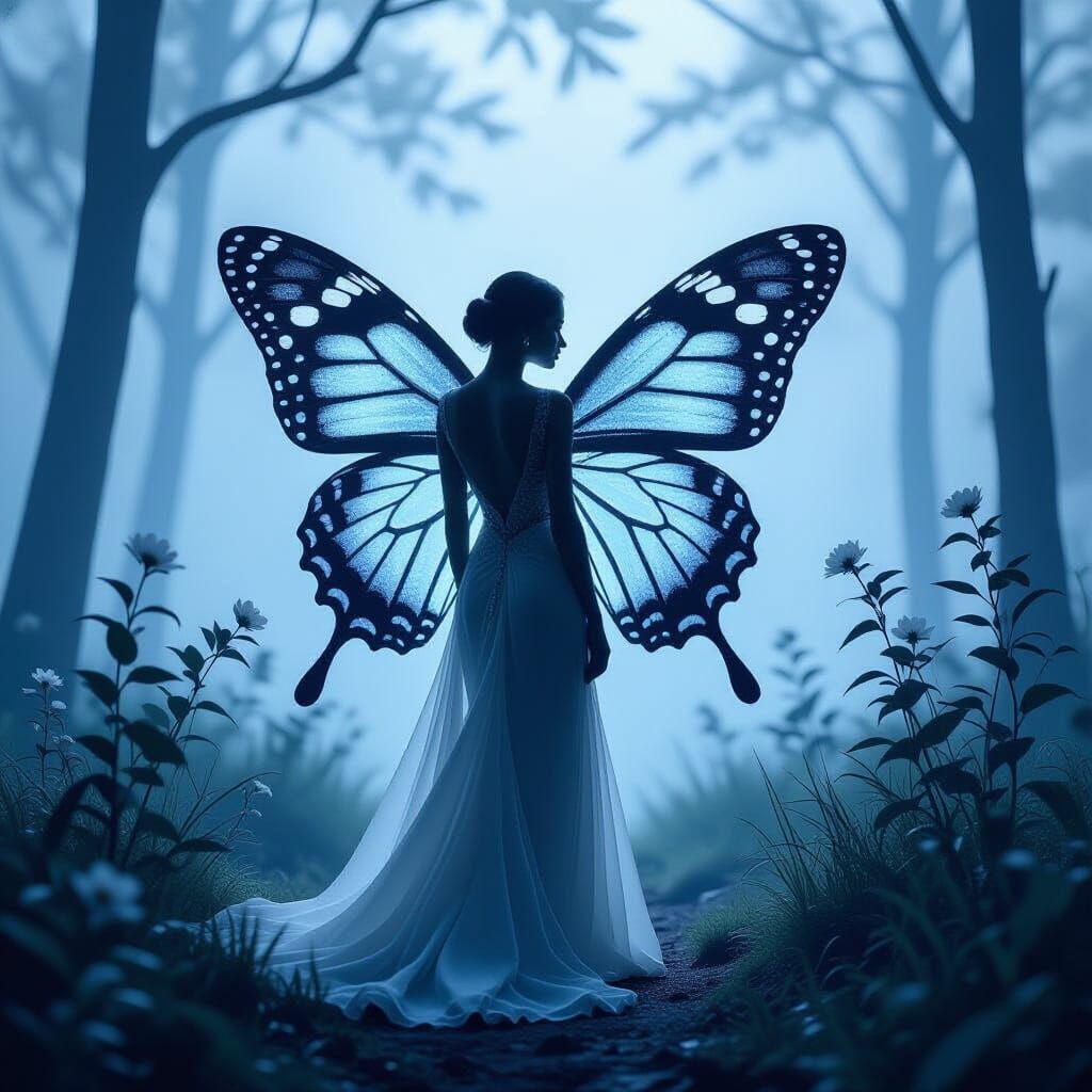 This image shows a high-contrast female silhouette with butterfly luminogram effects. The artwork features X-ray texture effects, a transparent aesthetic, and a posing illusion, set against a night flowers and forest backdrop.