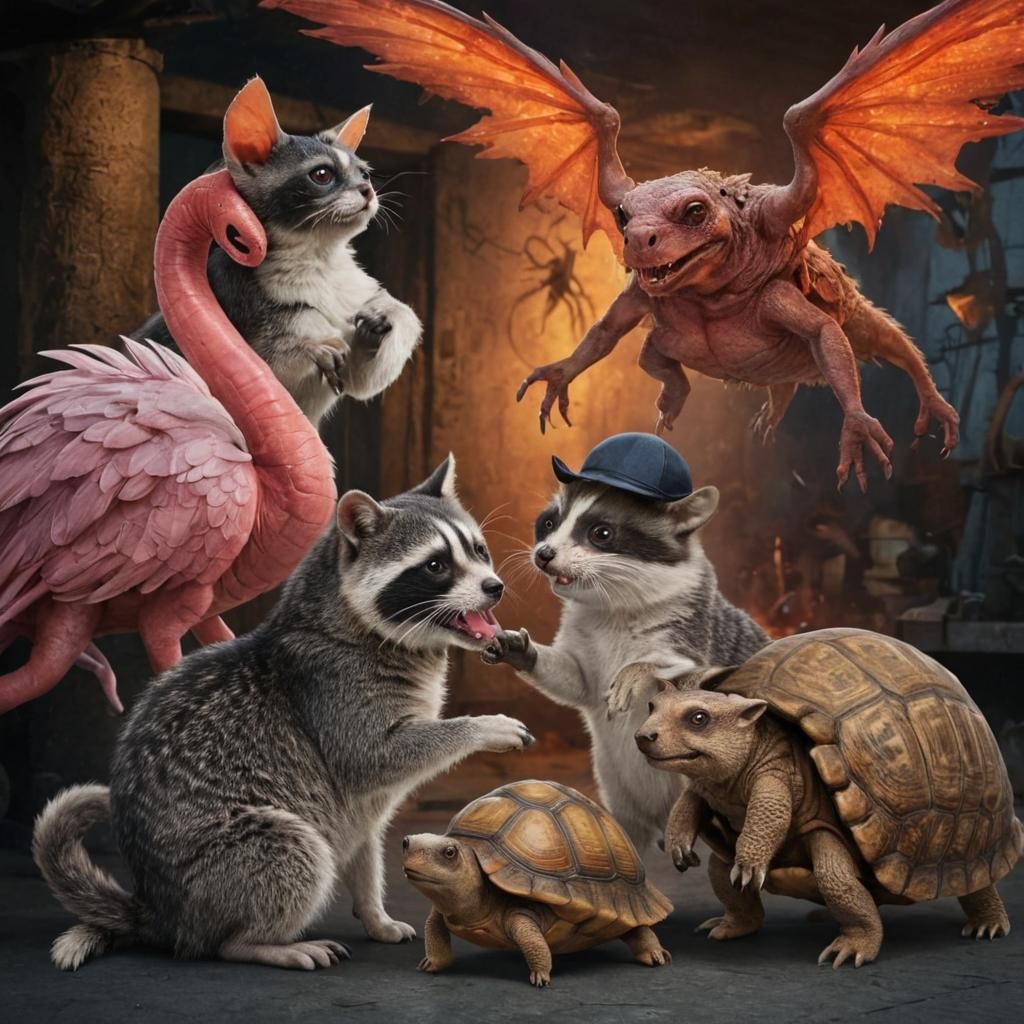 This image shows a bizarre mutant creature, a chimera of various animals including a flamingo, dog, cat, raccoon, turtle, and armadillo, featuring horns and wings.