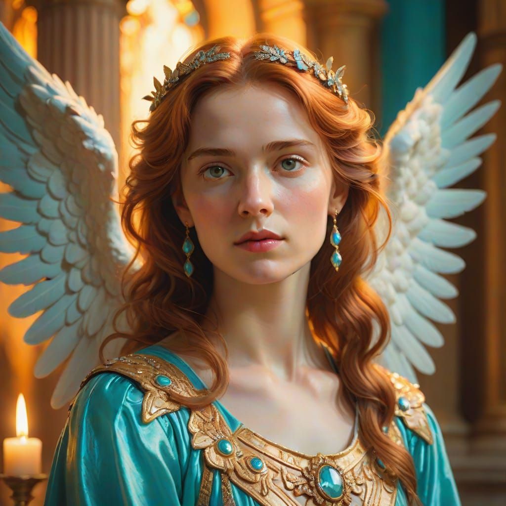 A baroque portrait of Archangel Jophiel in a temple. The painting features soft candlelight and warm colors, highlighting her auburn hair, coral wings and turquoise dress.