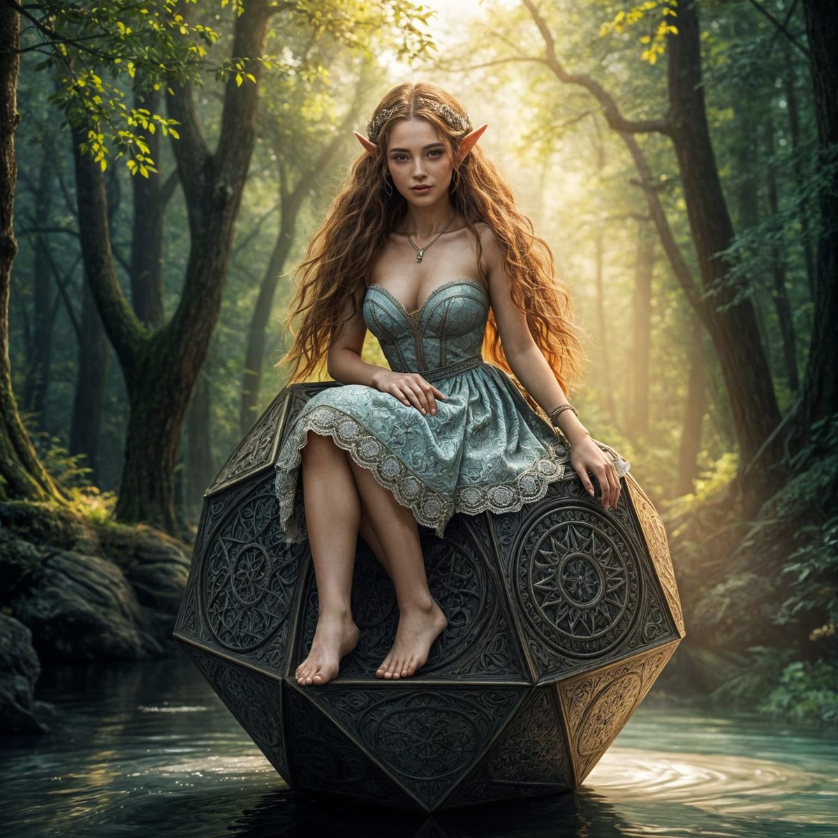 This image shows a beautiful elf woman sitting on a large, intricately engraved bronze dodecahedron in a serene forest setting, surrounded by lush greenery and reflecting off a calm body of water, radiating happiness and joy.