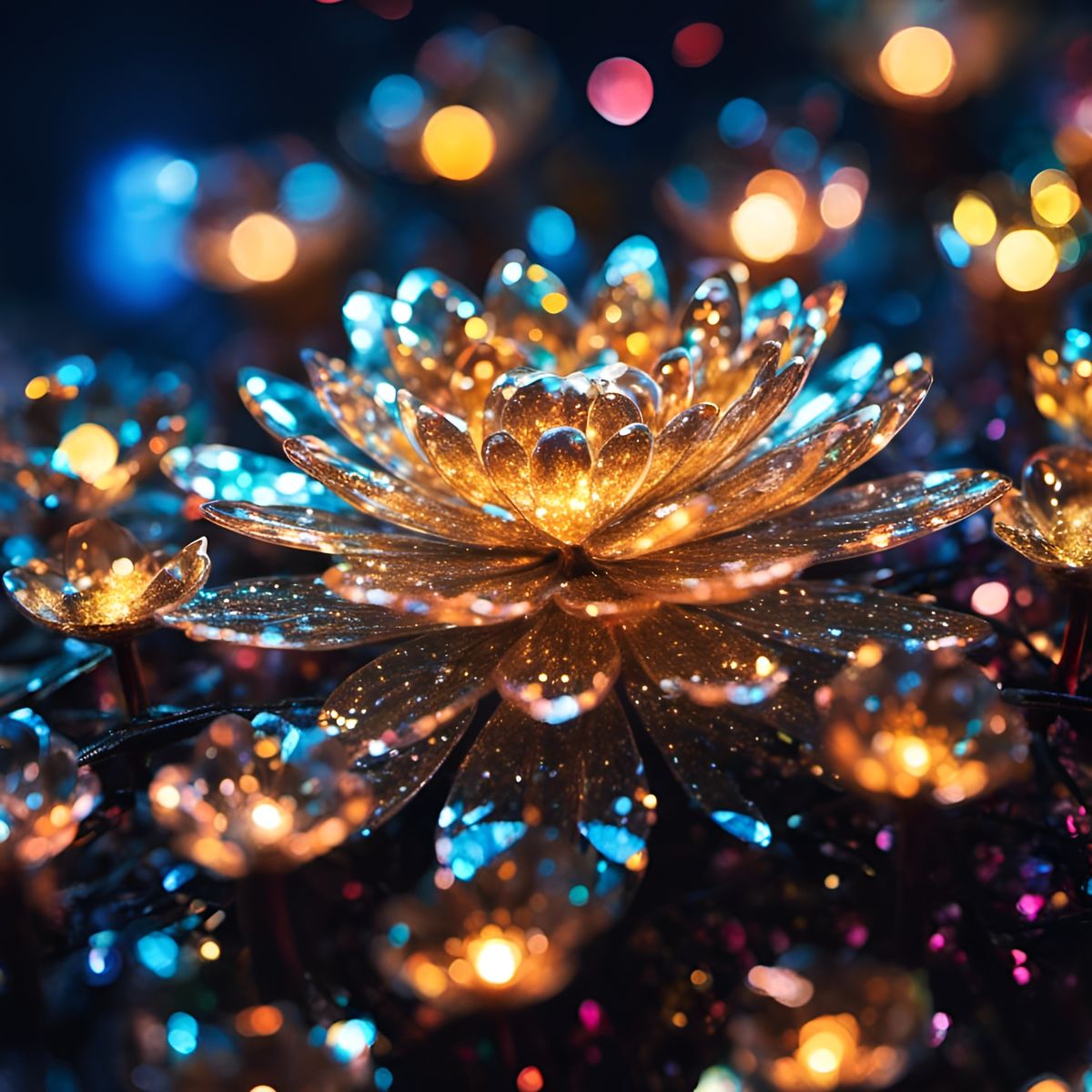 This image shows a macro photograph of illuminated glass flowers sparkling at night. It features hyperrealistic details, vibrant colors, and a chiaroscuro effect, rendered as mixed-media photography.