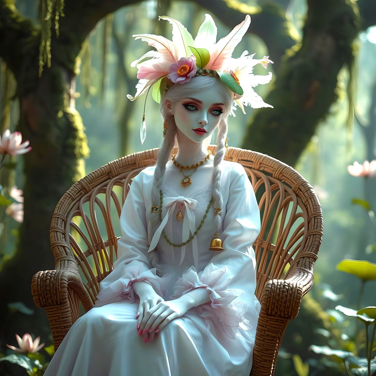 This image shows a translucent android vampire in a Victorian dress, seated in a garden. The artwork features complementary colors, neon glows, and ethereal details reminiscent of a cinematic portrait.