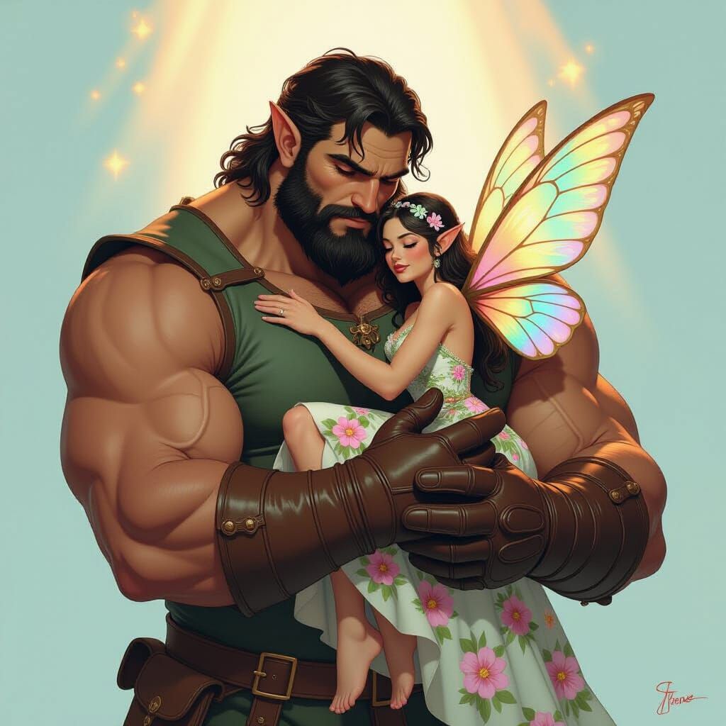 This image shows a gentle giant holding a fairy in his hand. The art style evokes comic book art, with intricate textures, soft gradients and warm lighting.