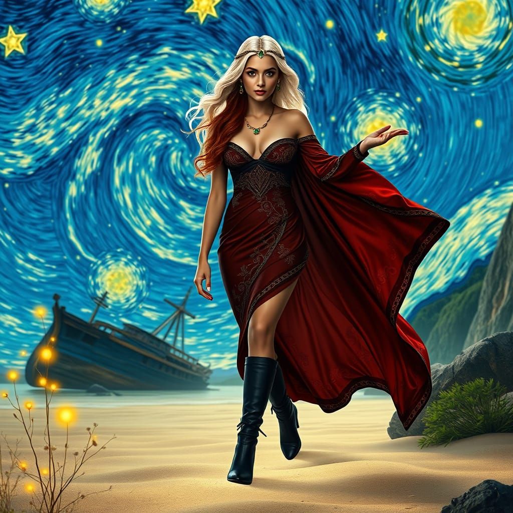 This image shows a mystical woman amidst a vibrant, swirling night sky with delicate plants and a serene, dreamlike atmosphere.