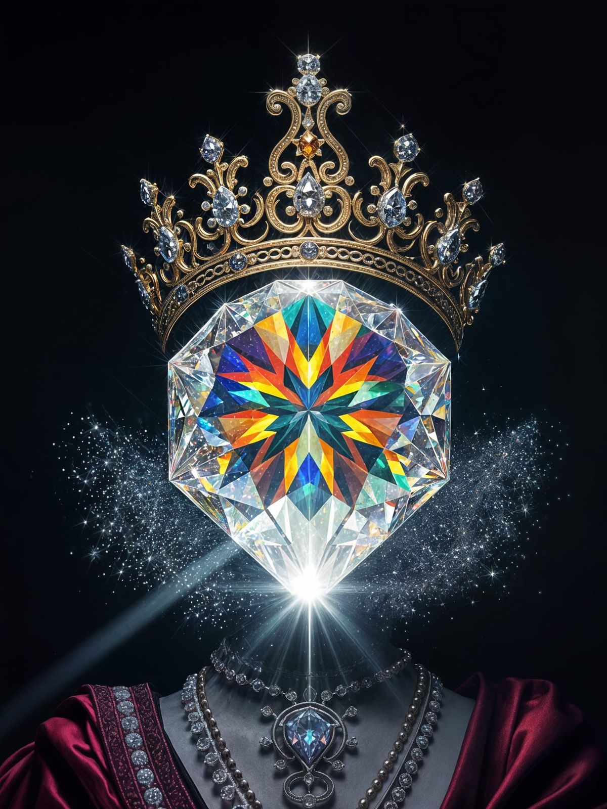 This image shows a stunning digital artwork of a queen's crown adorned with a radiant, high-contrast diamond, surrounded by swirling particles of light and a vibrant rainbow effect.