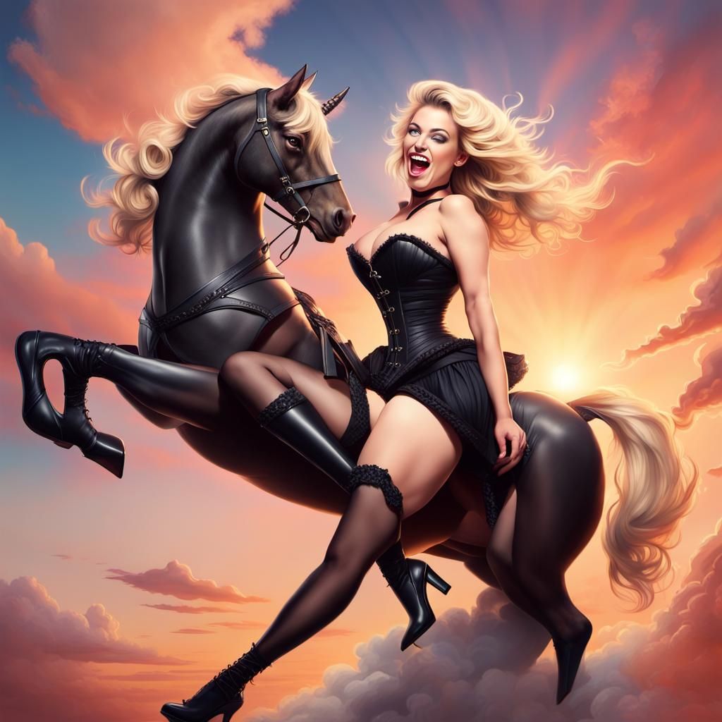 This image shows a pin-up style woman with blonde hair riding a winged horse at sunset. She is wearing a corset, pantyhose and high heels, rendered with hyperrealistic detail and vibrant colors.
