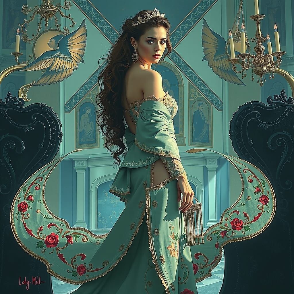 A surreal image of a woman in elaborate clothing set against a rich, fantastical backdrop. The scene uses a bold color palette and dramatic shadows in a Dadaist style.