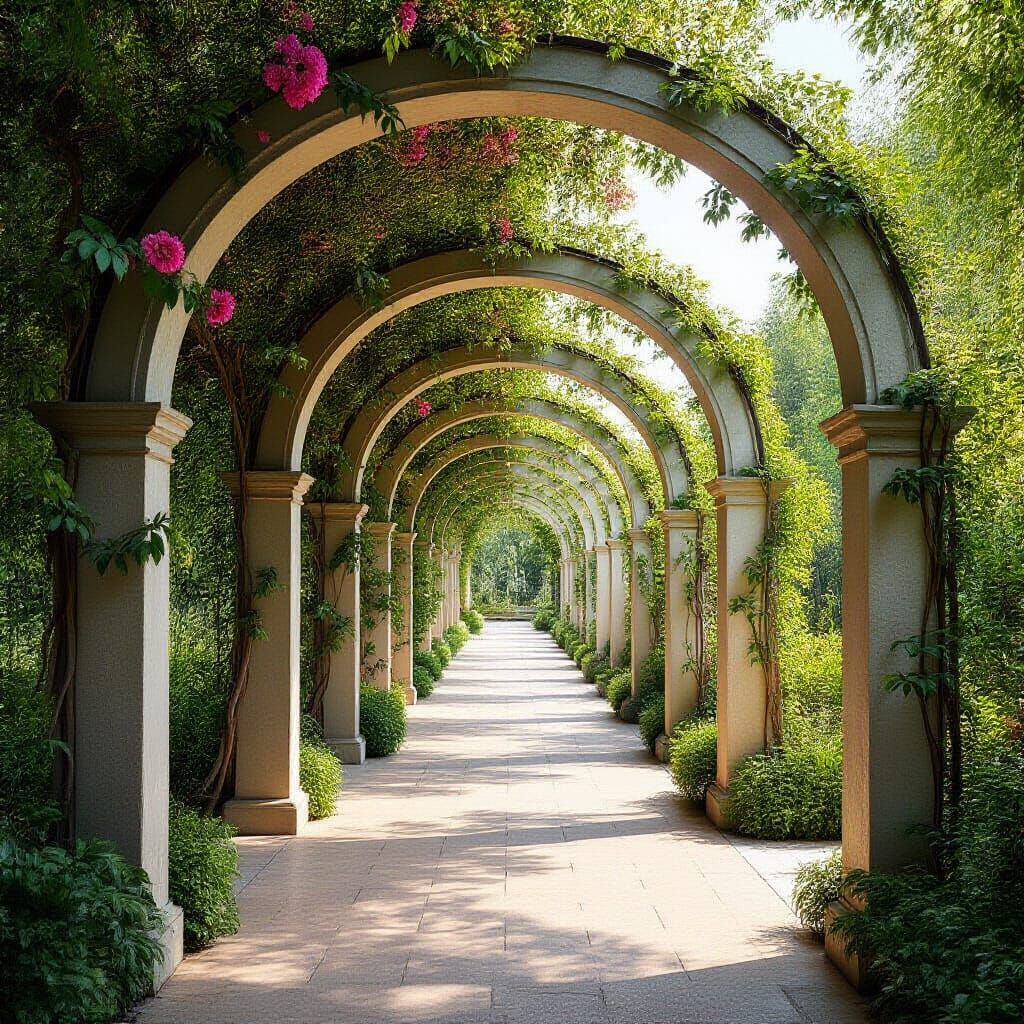This image depicts a serene botanical corridor featuring lush vines with flowers winding along repeating classical archways, merging geometric structure with organic beauty.
