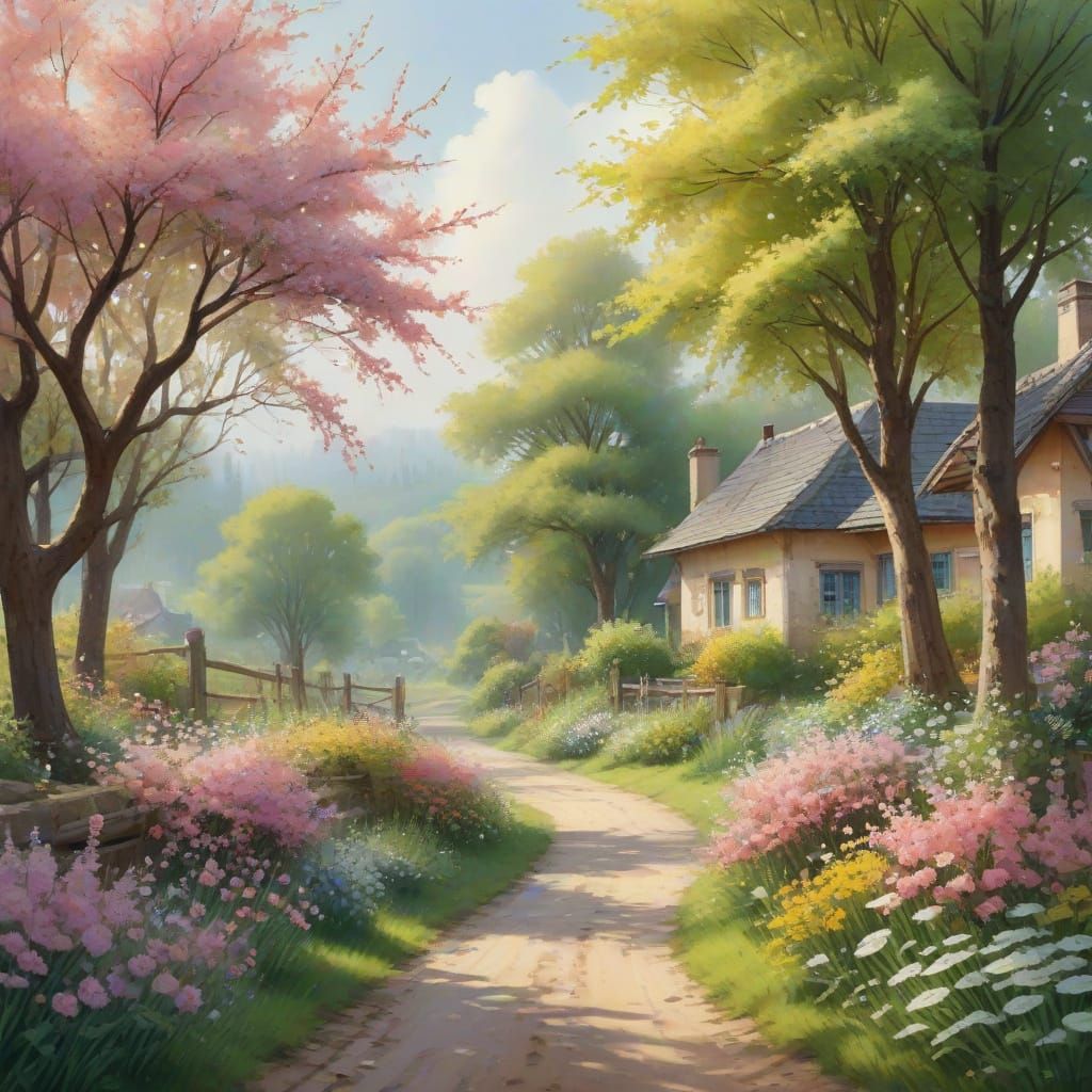 This image shows a serene spring village with lush gardens and blooming flowers, captured in a soft, watercolor style with warm colors and gentle brushstrokes.