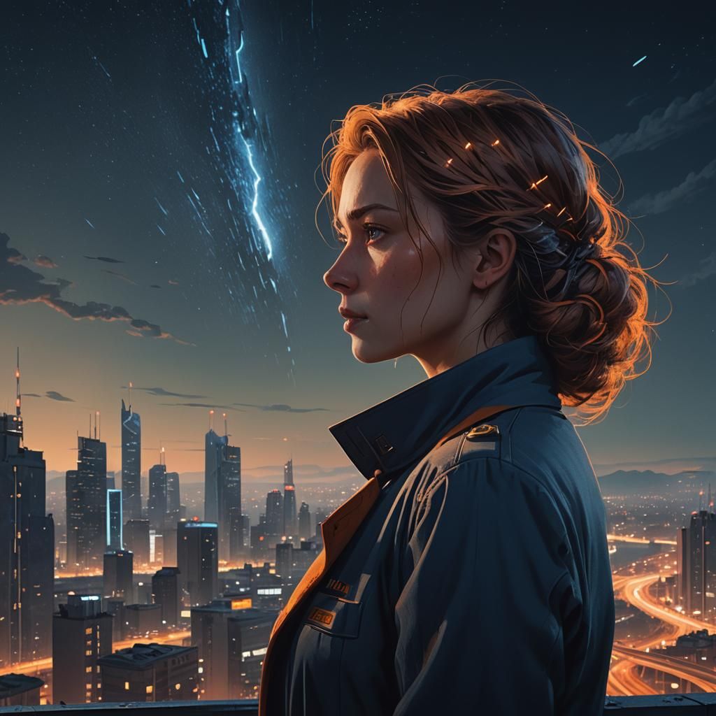 This image shows a woman gazing at a cityscape under a starry night sky. The digital matte painting features rich blues and oranges contrasting with neutral tones, in a fantasy art style.