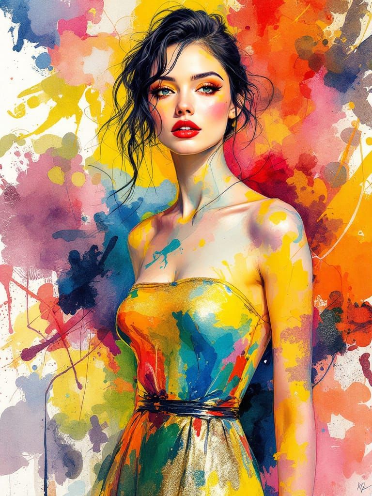 This image shows a bold 2030s pin-up woman in a metallic gold dress, rendered with dynamic ink lines and vibrant watercolor effects, evoking Fauvist energy and luminous color intensity.