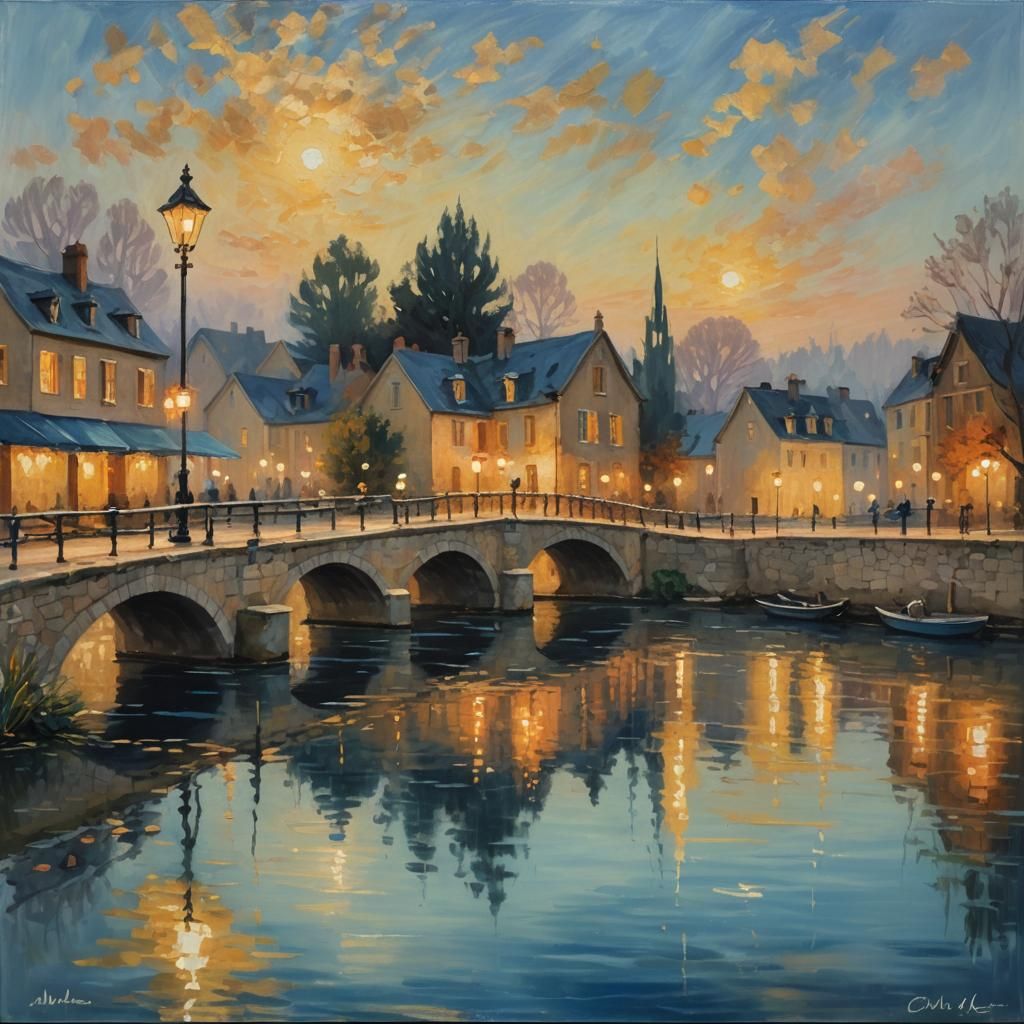 A picturesque waterside village with an old stone bridge at night, lit by glowing street lamps. This impressionist style painting features warm colors, soft brushstrokes, and reflections on the water.