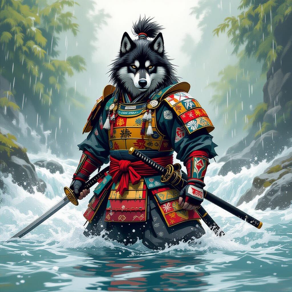 This image depicts a determined Ainu dog samurai warrior standing in a rushing river. He wears patterned samurai armor and wields a katana, rendered with vibrant colors and hyperrealistic detail, as digital artwork.